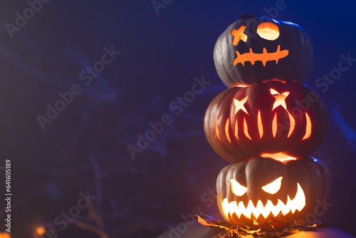 Fototapeta premium Carved pumpkins with copy space on blue background