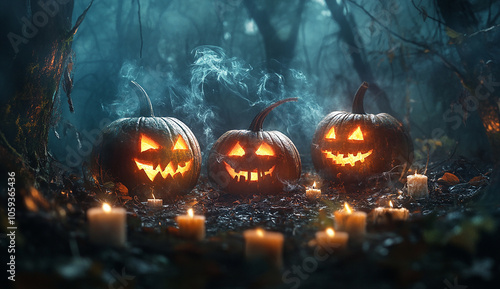 © Lilimanatasa, Naklejka premium carved pumpkins with smiling faces sit on the ground around them,a dark forest background creating a spooky Halloween scene