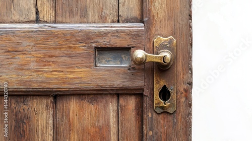 © Creations Photo , Fototapeta premium Carved wooden door with small window and brass latch, partially opened on white background.