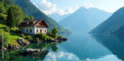 Fototapeta premium Casa sul lago con acque specchiata riflesso montagne, tranquillit?,...