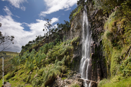 © carlosfelipet, Fototapeta premium Cascada entre la montaña con bosque joven de eucalipto
