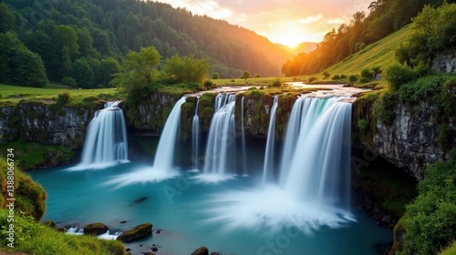 © Collse, Fototapeta premium Cascade du Ray Pic waterfall in France at dawn, with mild, sunny summer conditions, captured from a panoramic perspective.