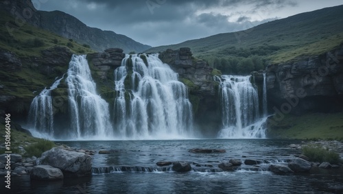 © Lasvu, Fototapeta premium Cascade Waterfall Lagonaki Plateau in Summer with Empty Copy Space for Text
