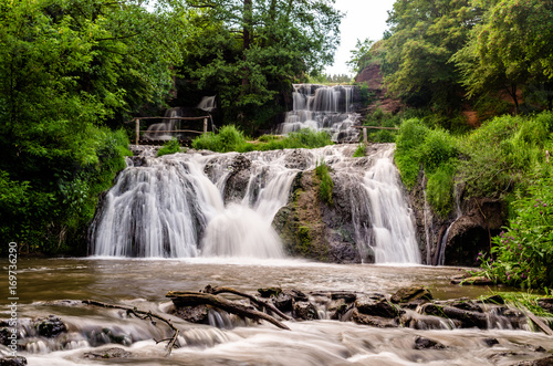 © Vasyl Diachuk, Obraz premium Cascaded waterfall in a green forest. Dzhurinsky waterfall Ukraine.