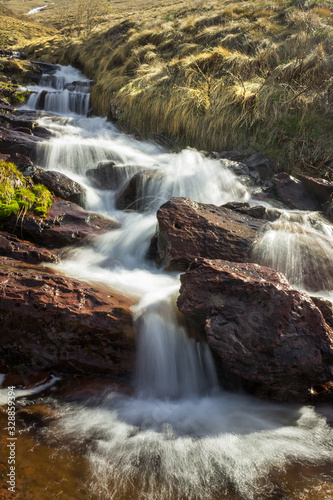 © Nikola, Fototapeta premium Cascades of powerful Monk's jump waterfall, the tallest in Serbia, streaming down the wet, red cliff rocks during early spring