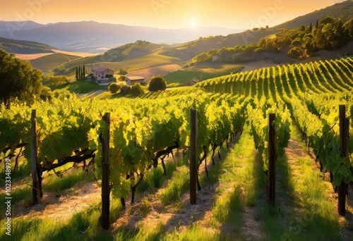 Naklejka premium cascading grape vines sunlit vineyard surrounded breathtaking natural scenery...