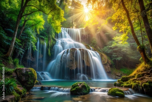 © nick, Obraz premium Cascading water thunders through lush green forests, a majestic waterfall scene.