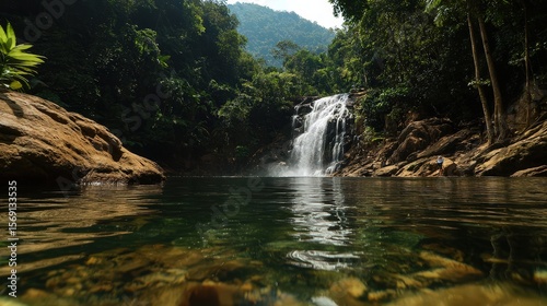 © Tinnaphat, Naklejka premium Cascading waterfall adventure lush forest setting nature photography tranquil environment ground-level perspective