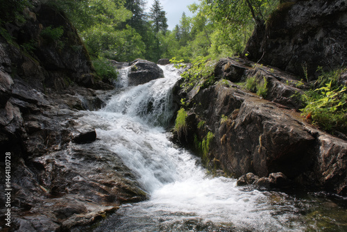 © Kim, Obraz premium Cascading waterfall flowing over dark rock in forest environment, peaceful