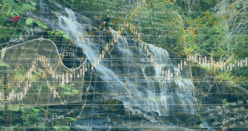 Fototapeta premium Cascading waterfall flowing over mossy rocks in forest, with candlestick and line graph overlays