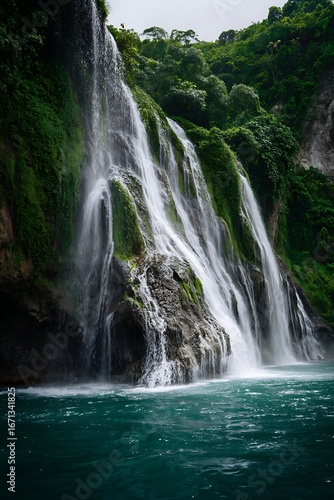 © Ibnu, Fototapeta premium Cascading waterfall flows over mossy rocks into a tranquil pool.