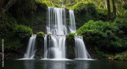 Fototapeta premium Cascading waterfall hidden within a lush forest background natural wonder creating soothing sounds enhancing the serene environment