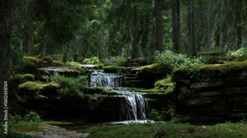 © Hungarian, Fototapeta premium Cascading waterfall in a lush, dark forest.
