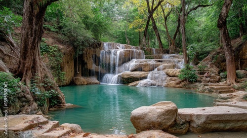 © 1989, Naklejka premium Cascading waterfall in a lush tropical forest.