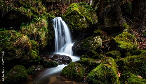 © Bagas, Obraz premium Cascading waterfall in a mossy forest