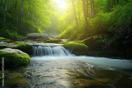 Obraz premium Cascading Waterfall in Lush Green Forest