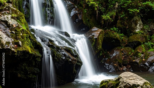 © Giyo, Fototapeta premium Cascading waterfall in mossy forest
