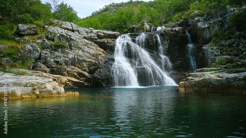 © raja, Obraz premium Cascading Waterfall into a Tranquil Pool in a Green Forest