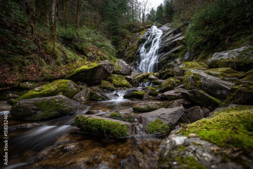 Obraz premium Cascading waterfall over mossy rocks in a forest, creating a peaceful and...