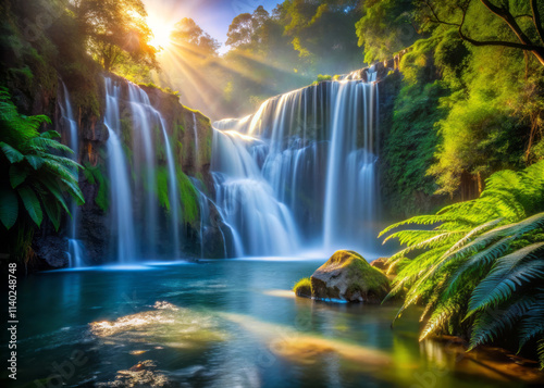 Fototapeta premium Cascading waterfall plunges into serene lake, surrounded by lush greenery and illuminated by sunlight. tranquil scene of nature beauty and harmony
