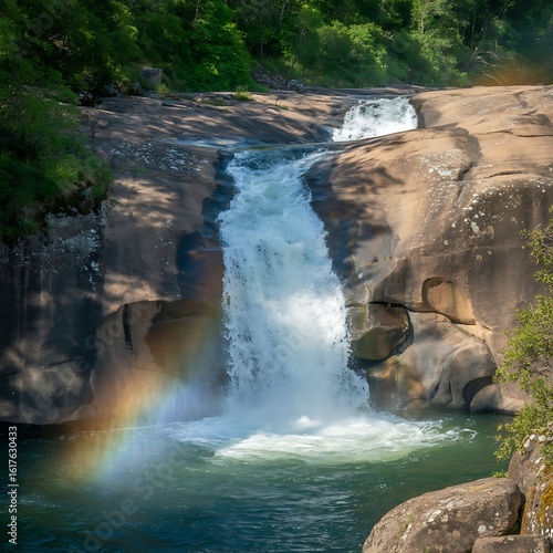 © Tule, Naklejka premium Cascading Waterfall with Rainbow and Lush Greenery