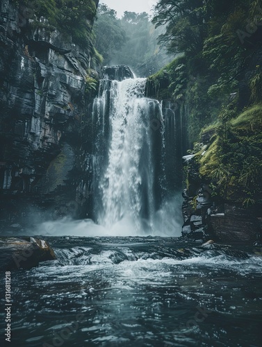 Naklejka premium Cascading wonder, Serene waterfall plunges through lush, rugged terrain
