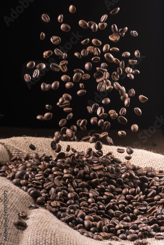 Obraz premium cascata di chicchi di caffè in sacco di iuta