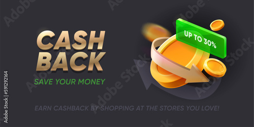 © Buch&Bee, Naklejka premium Cashback banner with coins and arrows indicating savings or rewards. Vector promotional background for financial offers, loyalty or shopping programs, cash back services and apps for saving money