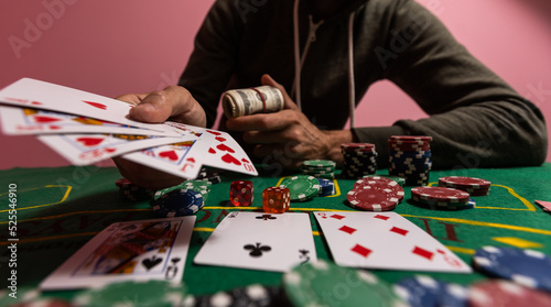 © Angelov, Obraz premium Casino, gambling and entertainment concept - stack of poker chips on a green table.