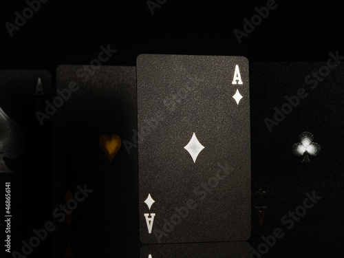 Obraz premium Casino, online casino background. Black poker cards with white and gold stamping on a black background. Gambling, poker, gambling business, game strategy, risk, cash flows.