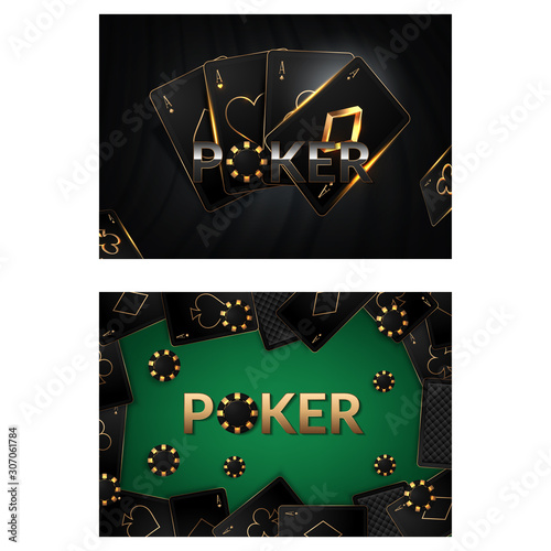 © vectorizer88, Obraz premium Casino poster or banner background or flyer template. Casino invitation with Playing Cards and Poker Chips. Game design. Playing casino games. Vector illustration
