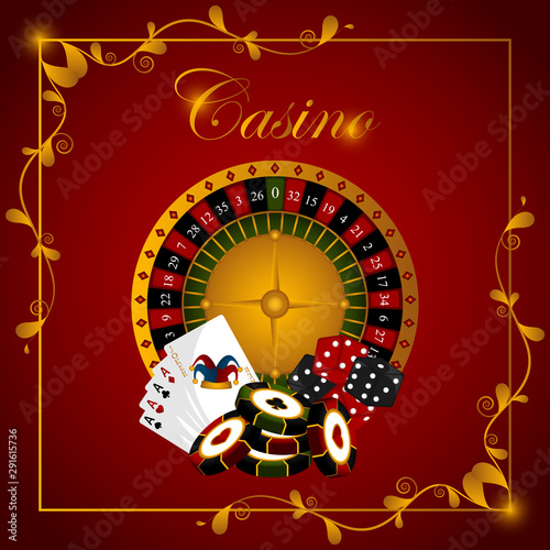 © lar01joka, Obraz premium Casino poster with roulette, playing card, poker chips nad dices - Vector