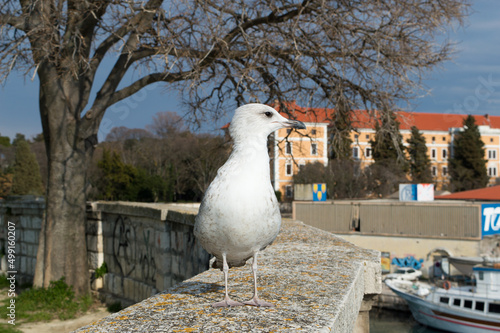 © amilat, Obraz premium Caspian gull, Larus cachinnans, standing on the stone wall, in Zadar, Croatia