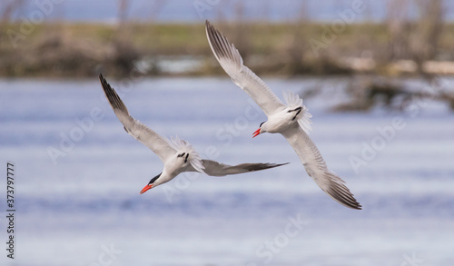 Obraz premium Caspian Terns Chase Each Other in Acrobatic Flight at Nisqually NWR