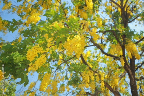 © suebsiri, Fototapeta premium cassia fistula. golden rain tree a flowering plant in the family Fabaceae. The species is native to the Indian subcontinent. known in Thai as ratchaphruek. tree in full yellow bloom.
