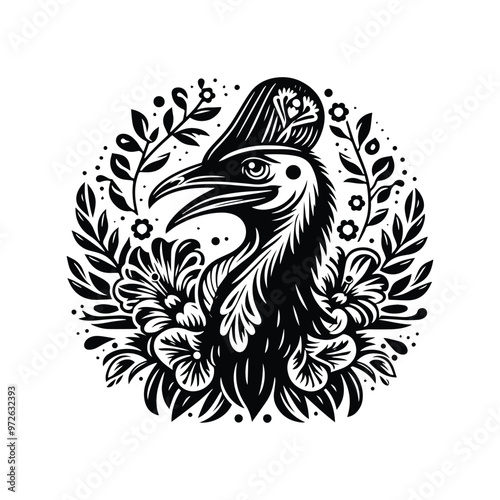 © Cici, Obraz premium Cassowary bird in folk art black and white silhouette illustration
