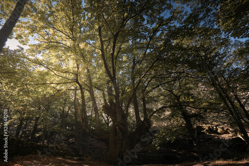 © Trepalio, Obraz premium Castaño centenario en el bosque encantado de castaños durante el otoño.