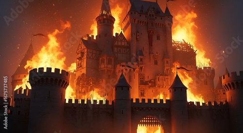 © Endruw, Fototapeta premium Castle Ablaze - A Fiery Architectural Disaster.