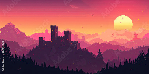 © dan, Fototapeta premium Castle background video game style illustration castles towers 8-bit, vintage computer graphics, generated ai