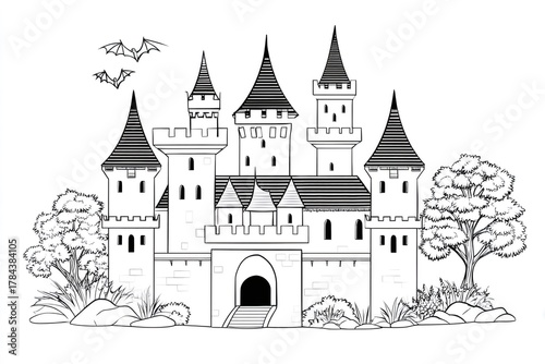 © kardaska, Obraz premium Castle drawing featuring bats for halloween coloring book