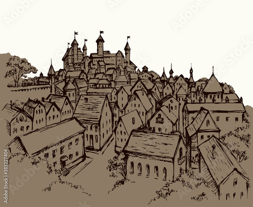 © Marina, Obraz premium Castle in the old town. Vector drawing