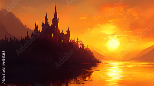 © Thiago, Obraz premium Castle in the sunset. Sky Castle. Illustration