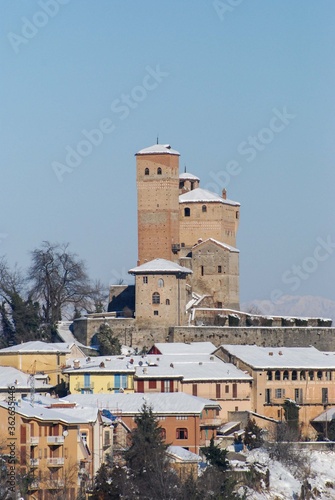 © Cosca, Fototapeta premium Castle of Serralunga d'Alba with snow, Piedmont - Italy