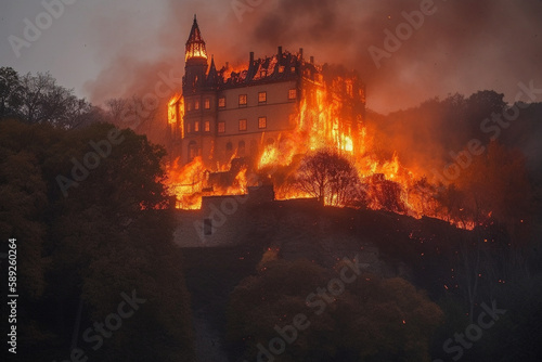 © dragomirescu, Fototapeta premium Castle on fire. Big conflagration or arson burning disaster with flames. Danger and destruction due to property blaze. Ai generated