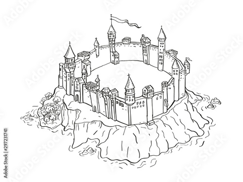 Fototapeta premium Castle or Fortress on Island Vintage Fantasy Map Cartoon Retro Drawing