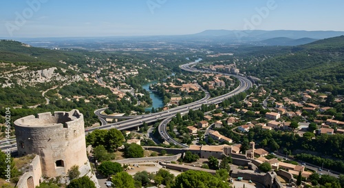 © arazka, Obraz premium Castle Overlooking Highway and River Valley in France