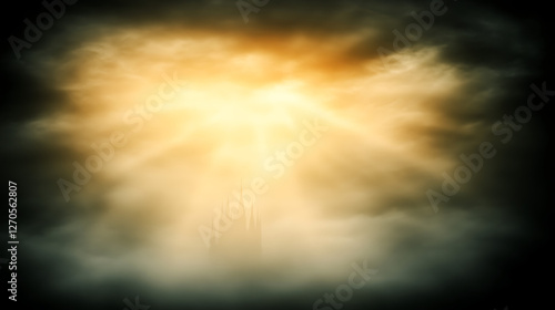 © Big9869, Fototapeta premium Castle Silhouette Emerging Through Cloudy Skies in Divine Light Emanating Radiantly Above