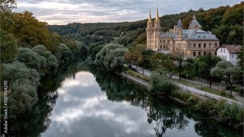 © ZinaZaval, Fototapeta premium Castle towers loom over a serene river mirroring a vibrant sunset, encircled by charming buildings and lush greenery