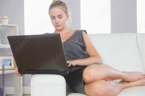 Fototapeta premium Casual stern blonde relaxing on couch using laptop