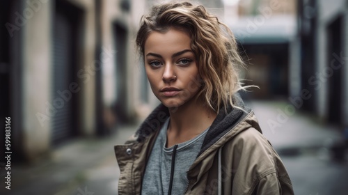 Fototapeta premium Casual Woman in Neutral Streetwear Posing Against Urban Landscape. Generative AI.